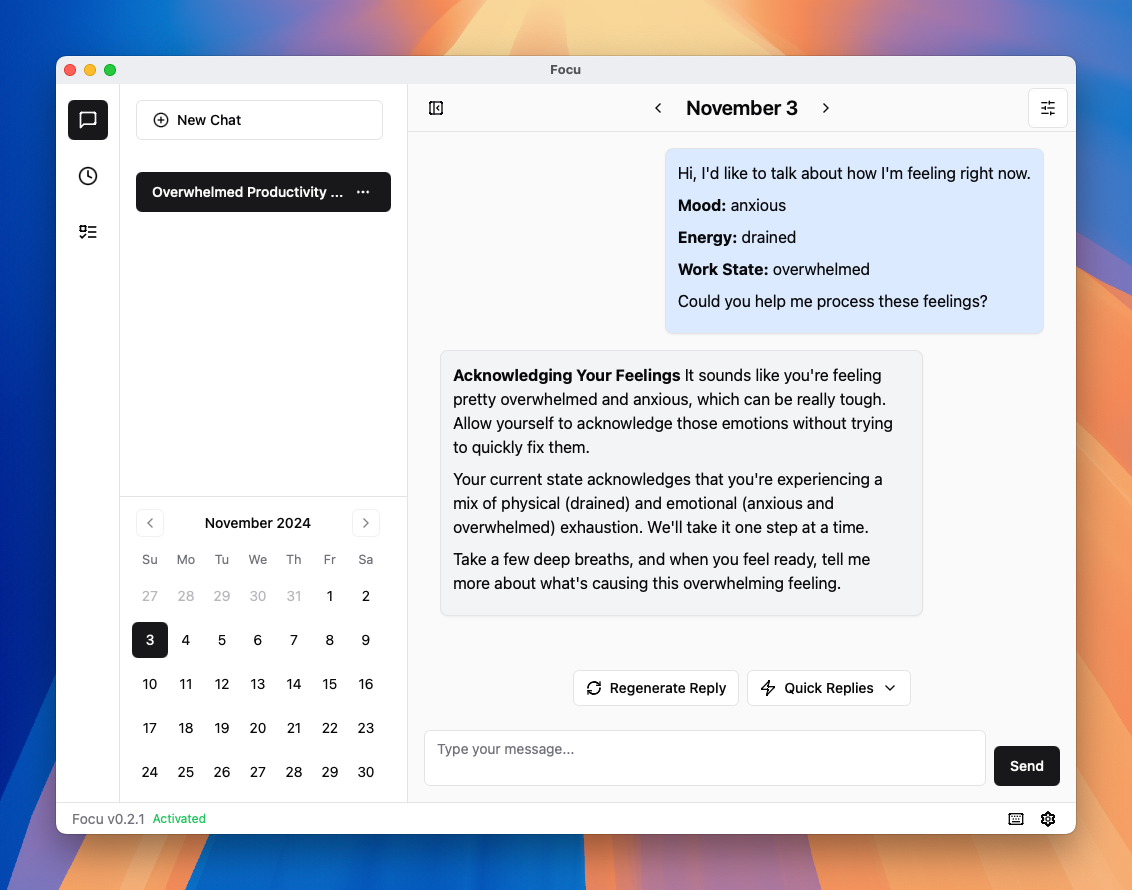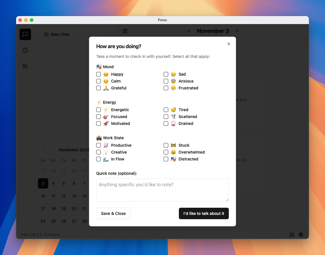 This version adds a new check-in feature that helps you track your mood, energy and work state. When you want to, you can instantly chat about it without having to write a message yourself: